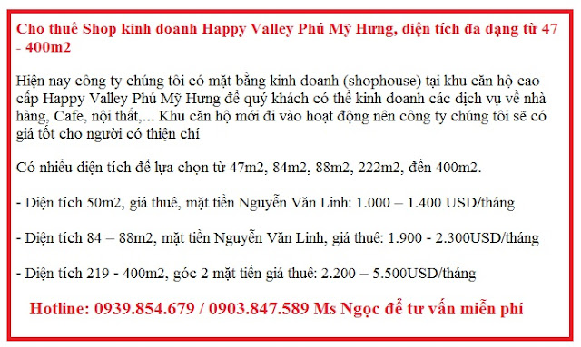 Cho thuê Shop kinh doanh Happy Valley Phú Mỹ Hưng giá rẻ, diện tích từ 47 - 400m2
